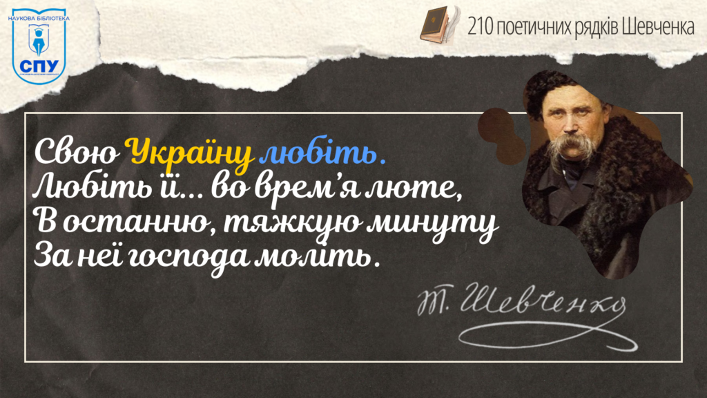 Впродовж двох місяців будемо створювати ювілейні листівки відомих і не дуже цитат з творів Тараса Шевченка. Запрошуємо університетську спільноту приєднуватися до нас. Діліться у Facebook під постами своїми улюбленими рядками з творчості поета, які вам близькі.